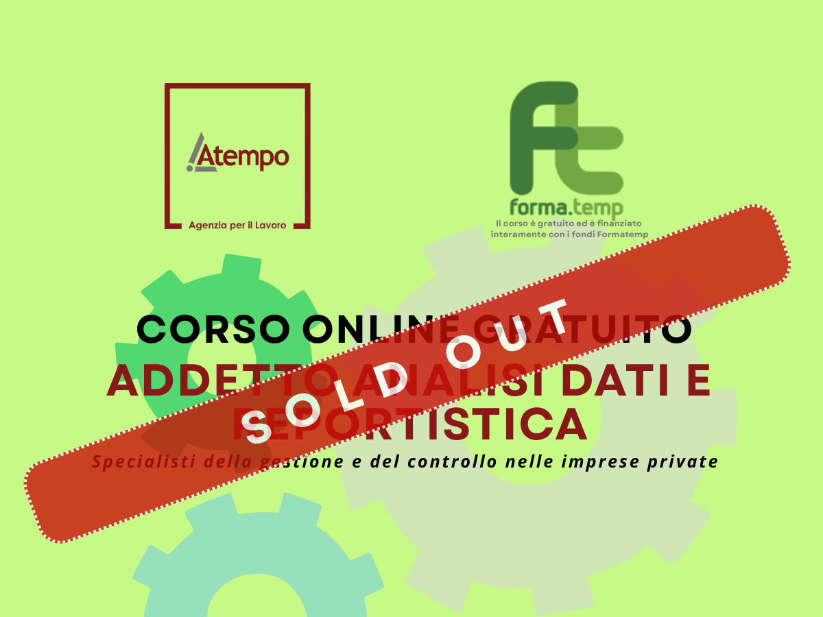 Atempo Spa - Agenzia per il Lavoro, ti propone un corso di formazione professionale totalmente GRATUITO e svolto interamente ONLINE, dedicato al tema “ADDETTO ANALISI DATI E REPORTISTICA” per formare “Specialisti della gestione e del controllo nelle imprese private.”